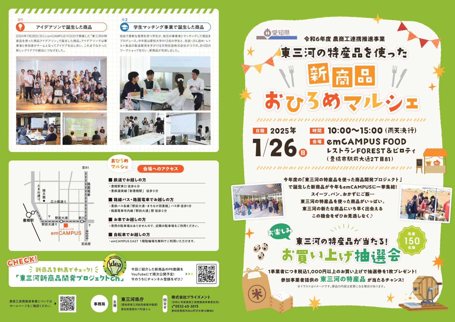 この度、10事業者による12品(7月28日に実施した「東三河の特産品を使った商品アイデアソン」(2024年5月22日発表済み。)において創出した1品及び事業者と学生が共同開発する学生マッチング事業による2品を含む)の商品が完成し、新商品完成披露及び販売イベントとして、emCAMPUS(エムキャンパス)(豊橋市)において「東三河の特産品を使った新商品おひろめマルシェ」(以下「マルシェ」)を開催します。東三河の新たな商品をまとめてお楽しみいただける機会ですので、是非お越しください。