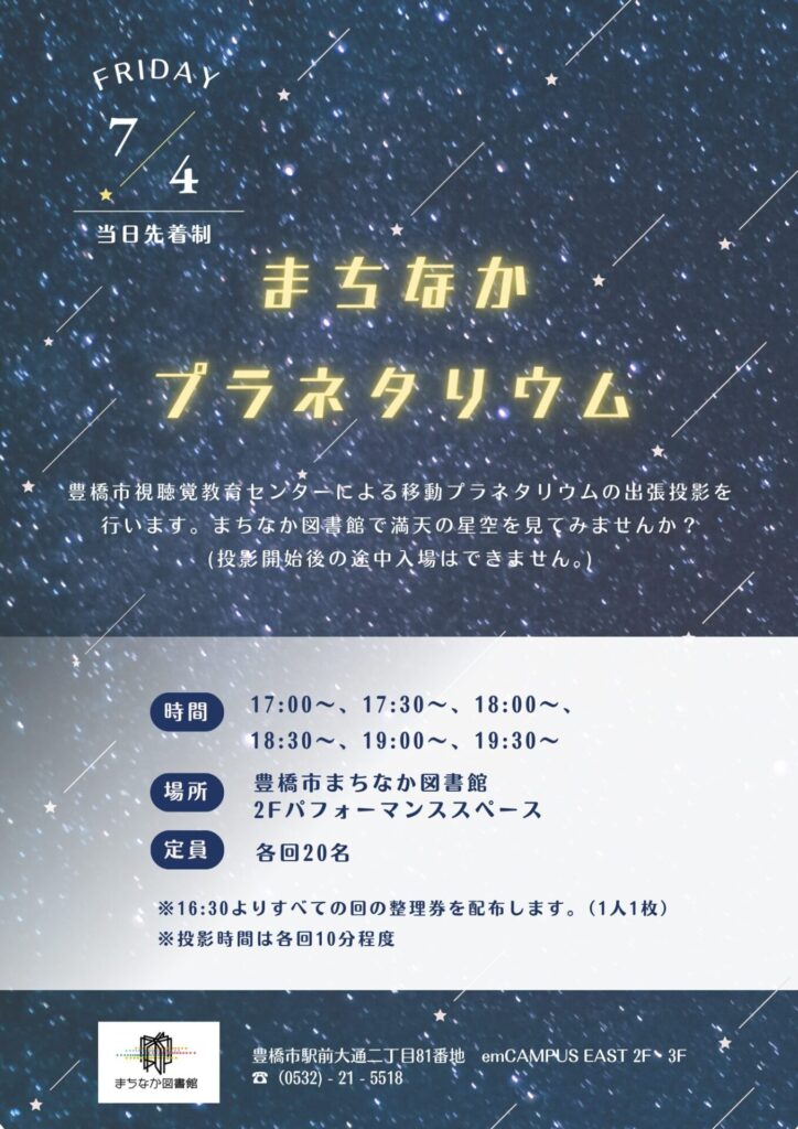豊橋市視聴覚教育センターによる移動プラネタリウムの出張投映を行います。まちなか図書館で満天の星空を見てみませんか?