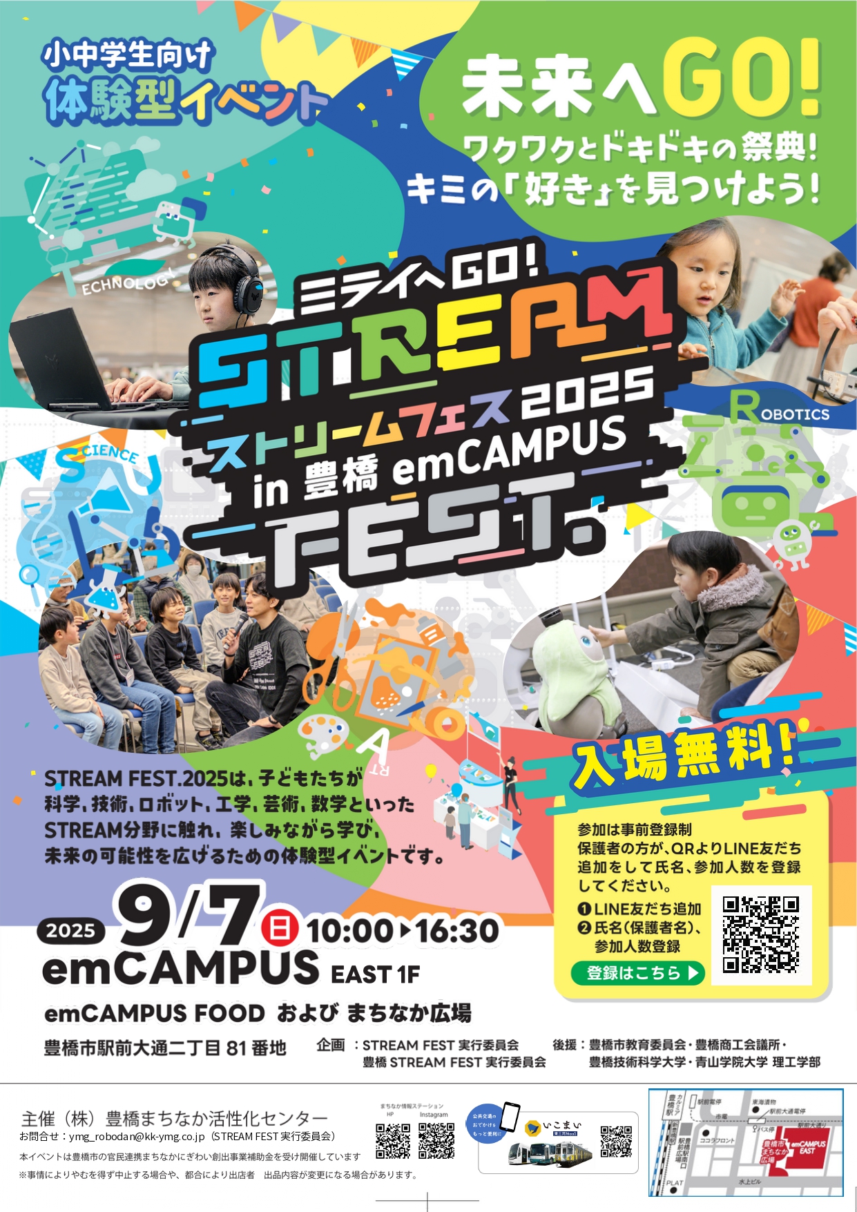 子どもたちが科学・技術・ロボット・工学・芸術・数学といったSTREAM分野に触れ、楽しみながら学び、未来の可能性を広げるための小中学生向け体験型イベントを開催します。STREAM FEST.とさまざまな企業がコラボし、ブースを出店します。たくさんのご家族のご来場をお待ちしております。