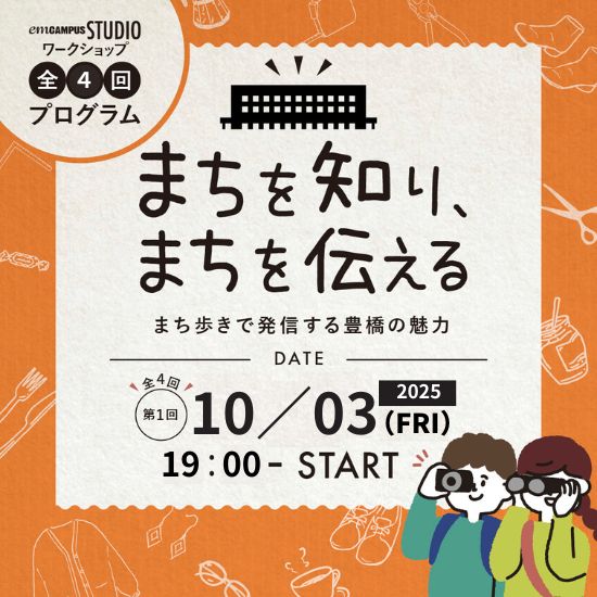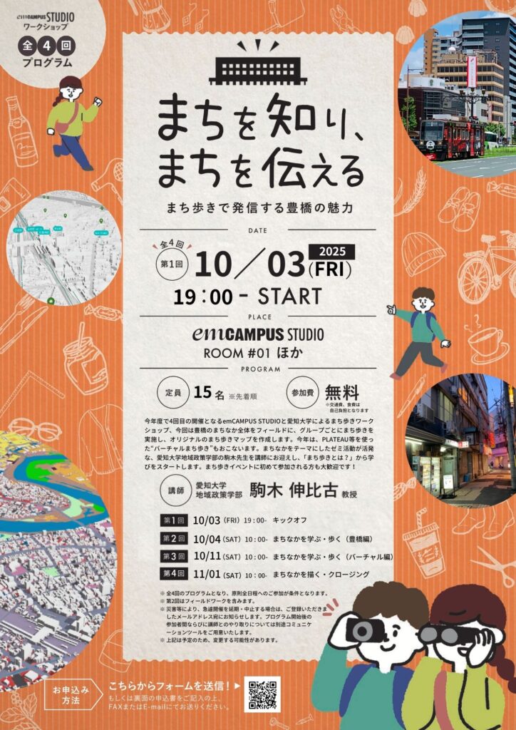 今年度で4回目の開催となるemCAMPUS STUDIOと愛知大学によるまち歩きワークショップ、今回は豊橋のまちなか全体をフィールドに、グループごとにまち歩きを実施し、オリジナルのまち歩きマップを作成します。