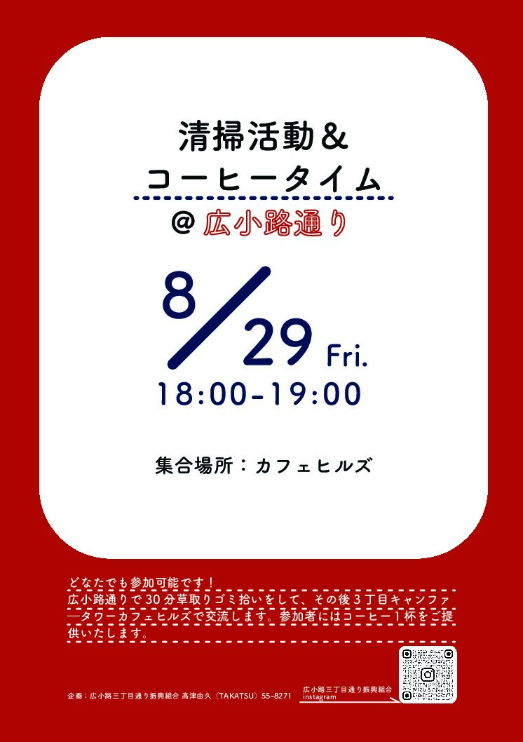 商店主さん、マンション住人はじめ、通りで働く皆さん、どなたでも気軽にご参加下さいませ。当日18時に広小路三丁目のカフェヒルズさん前に集合下さい。30分の作業終了後にはカフェヒルズさんがコーヒー1杯をご提供下さいます。