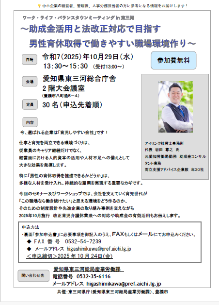 そこで、東三河県庁では中小企業の経営者、管理職、人事労務担当者等を対象に、企業における仕事と育児の両立支援の取組を促進するため、ワーク・ライフ・バランスタウンミーティングin東三河を開催します。