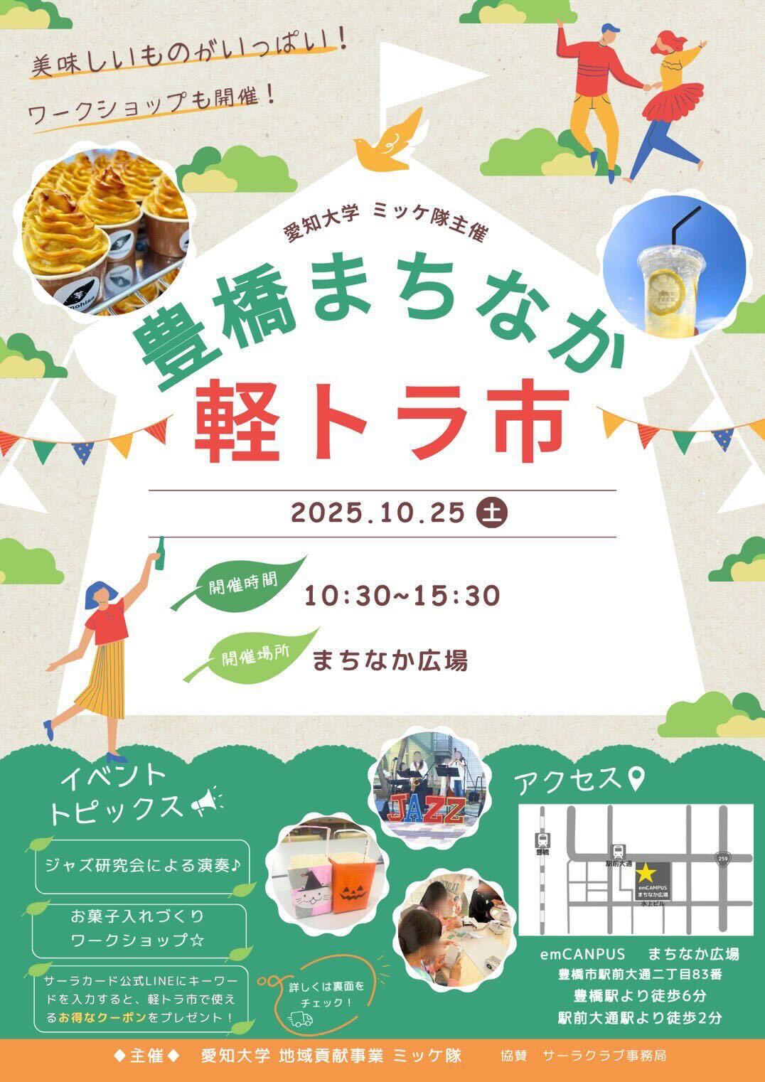 軽トラ市とは、軽トラックの荷台を店舗に見立てた朝市のことで、今では全国100か所以上で開催されています。豊橋まちなか軽トラ市では、東三河地域をはじめとした様々な出店者とともに、学生主催のワークショップを行います。東三河の魅力的なお店と、だれでも楽しめる軽トラ市の魅力をまちなかで発信していきます!