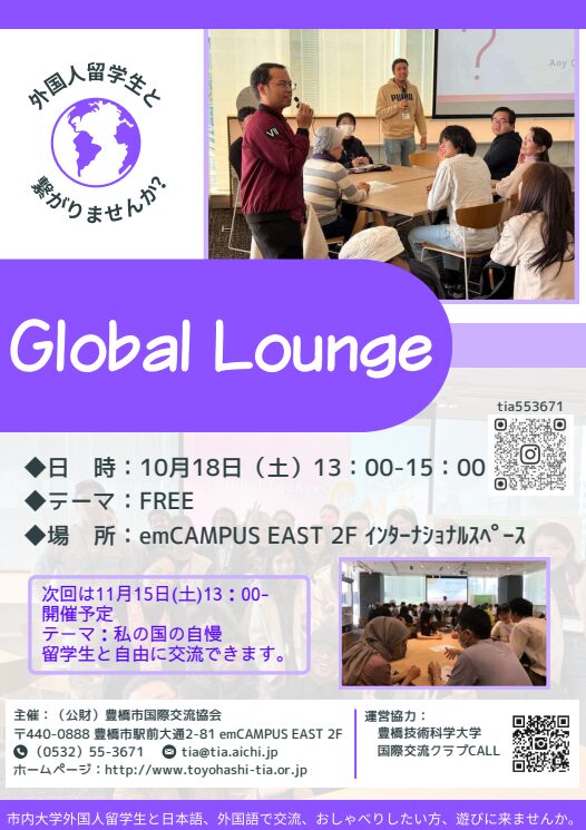 “GLOBAL LOUNGE”は「奇数月」は従来通り豊橋技術科学大学国際交流クラブ「CALL」の運営により旬の話題など様々なテーマでトークを盛り上げます。