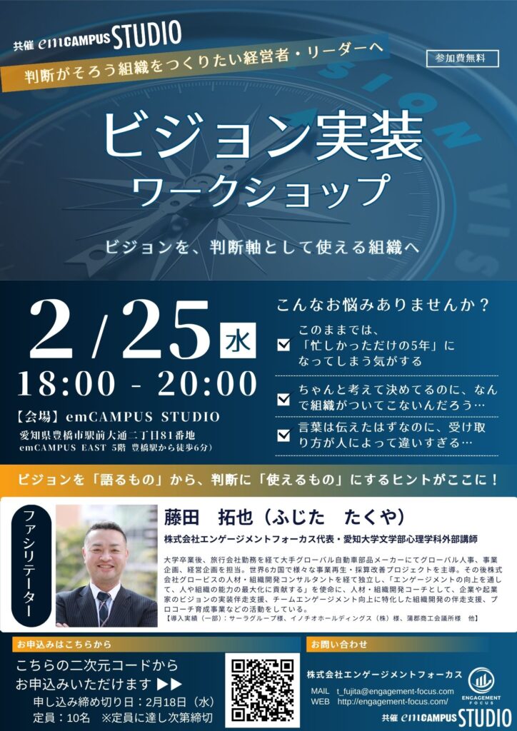 経営者・経営幹部を対象とした「ビジョン実装ワークショップ」を、emCAMPUS STUDIOとの共催により開催します。今回は、東三河の企業で豊富な支援実績を持つ(株)エンゲージメントフォーカス・藤田拓也氏を講師に迎えます。「想いはあるのに組織が動かない」という経営課題に対し、その原因を「個人の資質」ではなく「構造のズレ」から読み解く独自のメソッドを、無料で体感的に学べます。