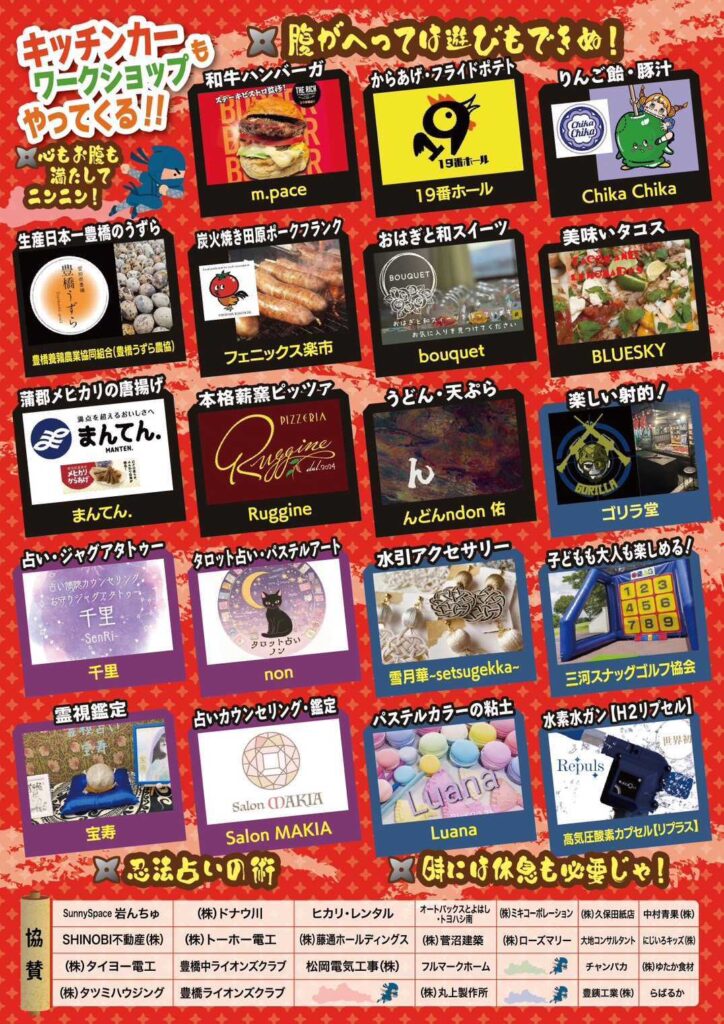 まちなかにんじゃパークを一緒に盛り上げてくれるグルメやワークショップも多数出店します。