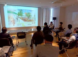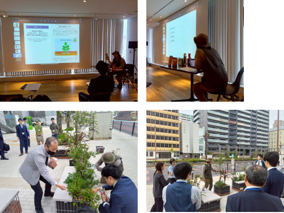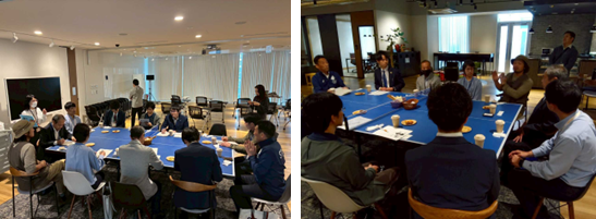 施肥作業後は、emCAMPUS STUDIOに戻り、コーヒーや紅茶、お茶菓子を楽しみながら参加者の自己紹介や各会社、団体で行っている事業等の紹介を行い、親睦を深めました。