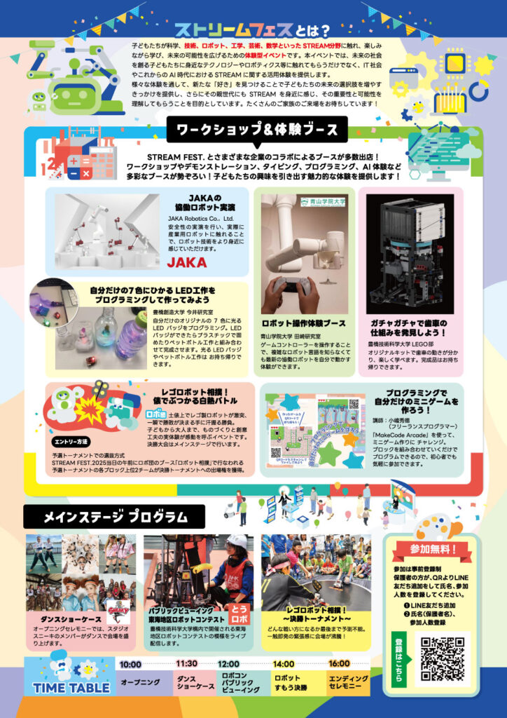 子どもたちが科学・技術・ロボット・工学・芸術・数学といったSTREAM分野に触れ、楽しみながら学び、未来の可能性を広げるための小中学生向け体験型イベントを開催します。STREAM FEST.とさまざまな企業がコラボし、ブースを出店します。たくさんのご家族のご来場をお待ちしております。