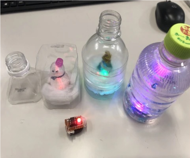 自分だけのオリジナルの7色に光るLEDバッジをプログラミング。LEDバッジが出来たらプラスチックで固めたり、ペットボトル工作と組み合わせて完成させます。光るLEDバッジやペットボトル工作はお持ち帰りできます。