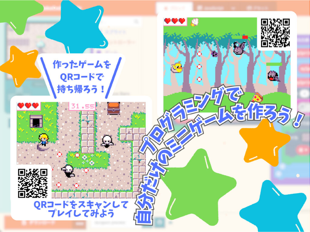 「MakeCode Arcode」を使って、ミニゲーム作りにチャレンジ。ブロックを組み合わせていくだけでプログラムできるので、初心者でも気軽に参加できます。
